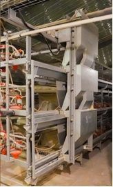 喂料机通常包括料盘式、行车式和链条式等,建议采用行车喂料系统(图3)。笼具各层应设有料槽,行车沿料槽布置方向运行时各层出料口实现同时出料。