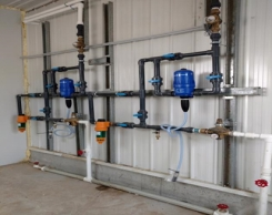 应采用乳头饮水线式自动饮水系统,包括饮水水管、饮水乳头、加药器、调压器、减压阀、反冲水线系统和智能控制系统(图4)。鸡舍水线进水处应设置加药器、过滤器,实现饮水过滤和自动化饮水加药。育雏育成前期,各层靠近笼顶网和料槽一侧,应设有高度可调节饮水管线,各笼布置2-3个乳头饮水器,在乳头饮水器下方安装水杯;育成后期和产蛋期,在中间隔网与顶网之间安装饮水管线和“V”型水槽,防止饮水漏至清粪带上。饮水管线等应采用耐腐蚀塑料材质。各层水线应设置水压调压器,保证各层水线前端和尾端充足供水。