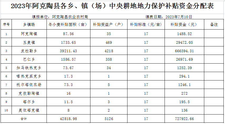 2023年阿克陶县各乡、镇(场)耕地地力保护补贴发放情况报告
