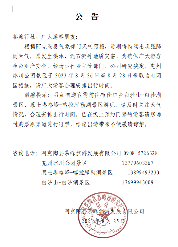 根据阿克陶县气象部门天气预报,近期将持续出现强降雨天气,易发生洪水、泥石流等地质灾害,为确保广大游客生命财产安全,经研究决定,克州冰川公园景区于2023年8月26日至8月28日采取临时闭园措施,请广大游客合理安排出行时间。