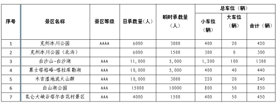 切实保障游客安全与游览体验,根据《中华人民共和国旅游法》及《景区最大承载量核定导则》,现将克州冰川公园、白沙山-白沙湖景区、慕士塔格峰-喀拉库勒湖、木吉湿地泥火山群景区承载量及车位信息公告如下: