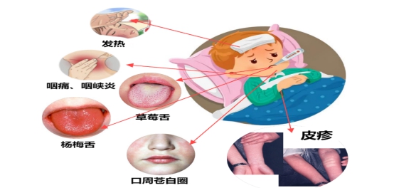高热、伴有咽痛、咽峡炎(充血甚至化脓),“草莓舌”“杨梅舌”、口周苍白圈,皮疹及疹褪后皮肤脱屑。