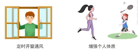 2.要加强体育锻炼、增强个人体质,每天定时开窗通风、呼吸新鲜空气,减少不必要的公共场所聚集活动。