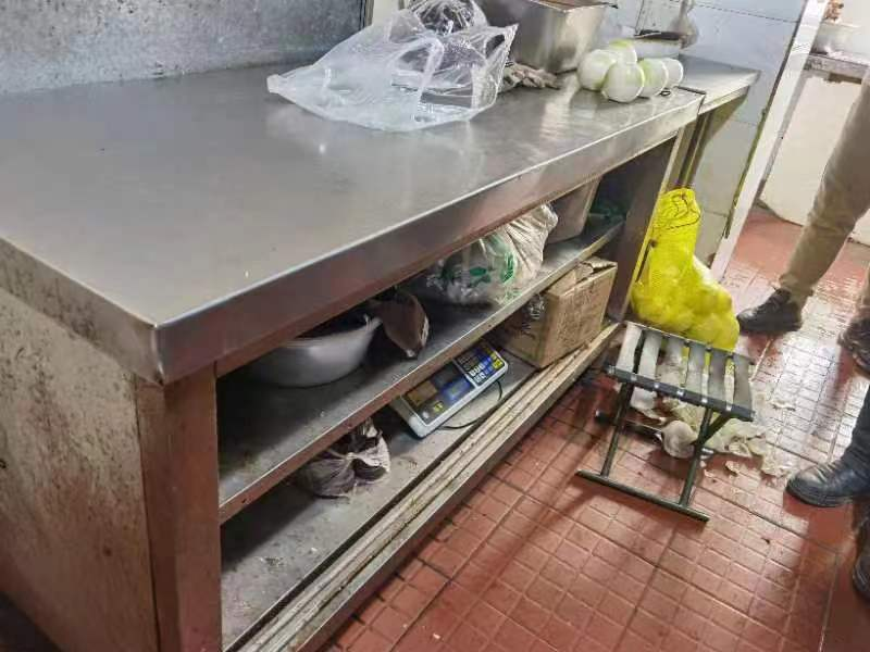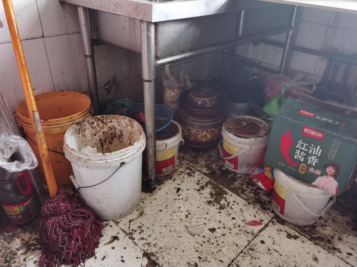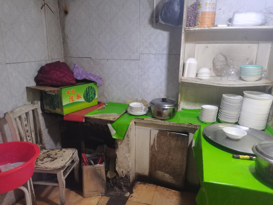 上榜理由:操作台面物品摆放混乱,灶台区域杂乱,灶台表面、墙面油渍明显,厨房整体环境卫生脏乱差;食品原材料、成品、半成品混放,存在交叉污染风险;经营场所混乱,后堂私人物品乱堆乱放,没有进行分区。