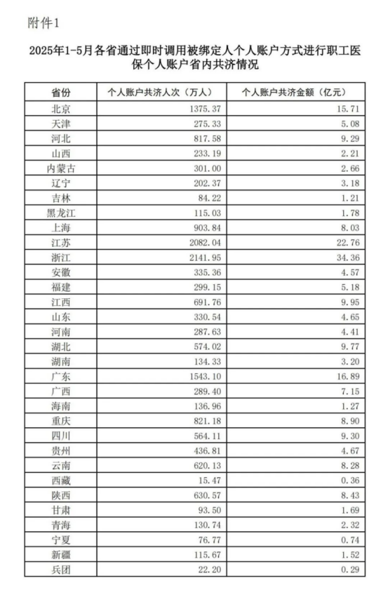 目前,职工医保个人账户共济可以通过即时调用被绑定人个人账户、医保钱包转账等方式实现。2025年1-5月职工医保个人账户共济人次1.67亿,金额220.26亿元。