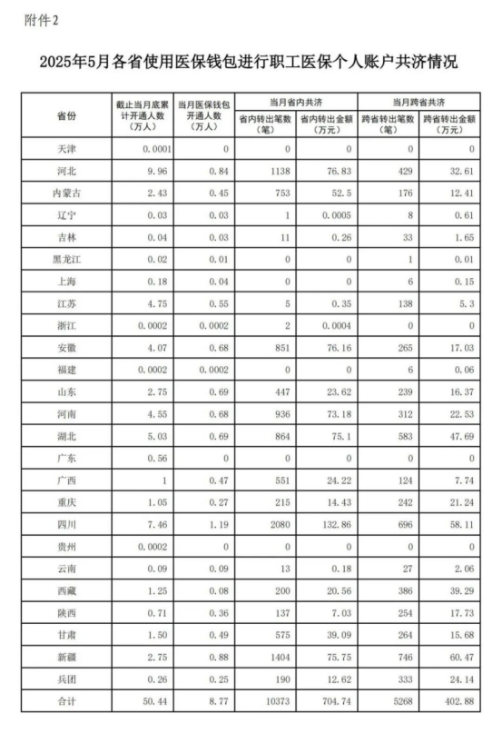 2025年5月,通过医保钱包转账方式进行职工医保个人账户省内、跨省共济共1.56万笔,转账金额1107.62万元;支付就医购药费用总计0.86万笔,支付金额142.32万元。从共济地域看,省内转账1.04万笔,转账金额704.74万元;跨省转账0.52万笔,转账金额402.88万元。