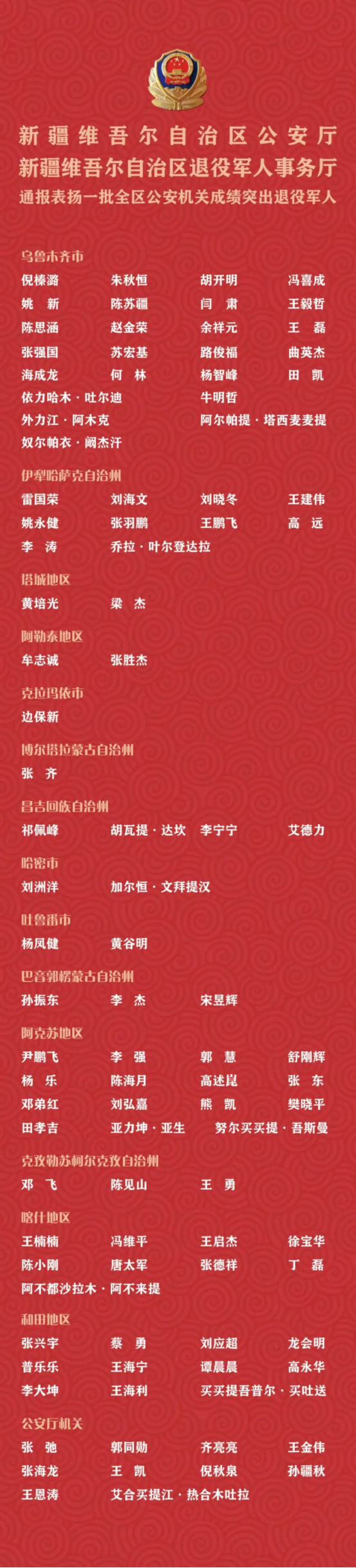 近日,新疆维吾尔自治区公安厅、新疆维吾尔自治区退役军人事务厅对全区公安机关100名成绩突出退役军人予以通报表扬。