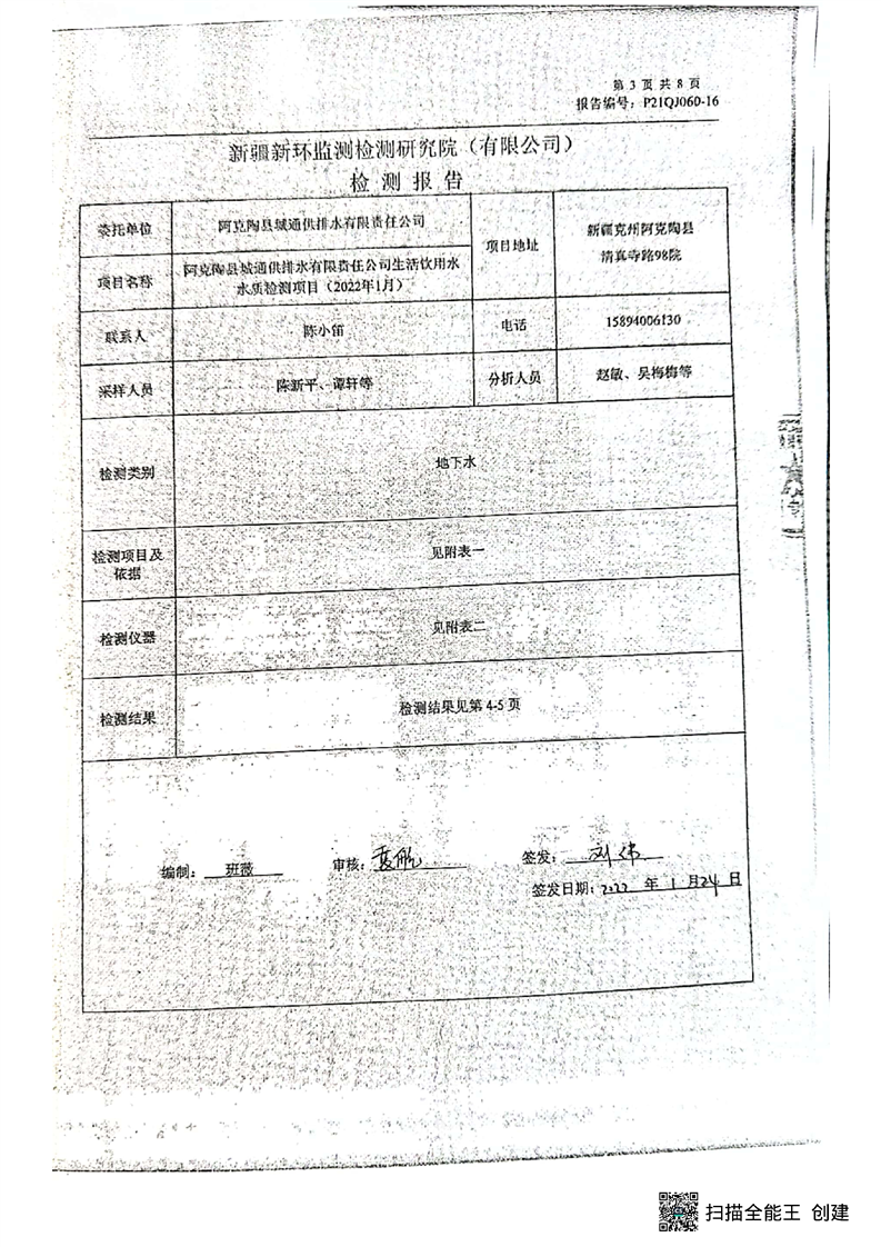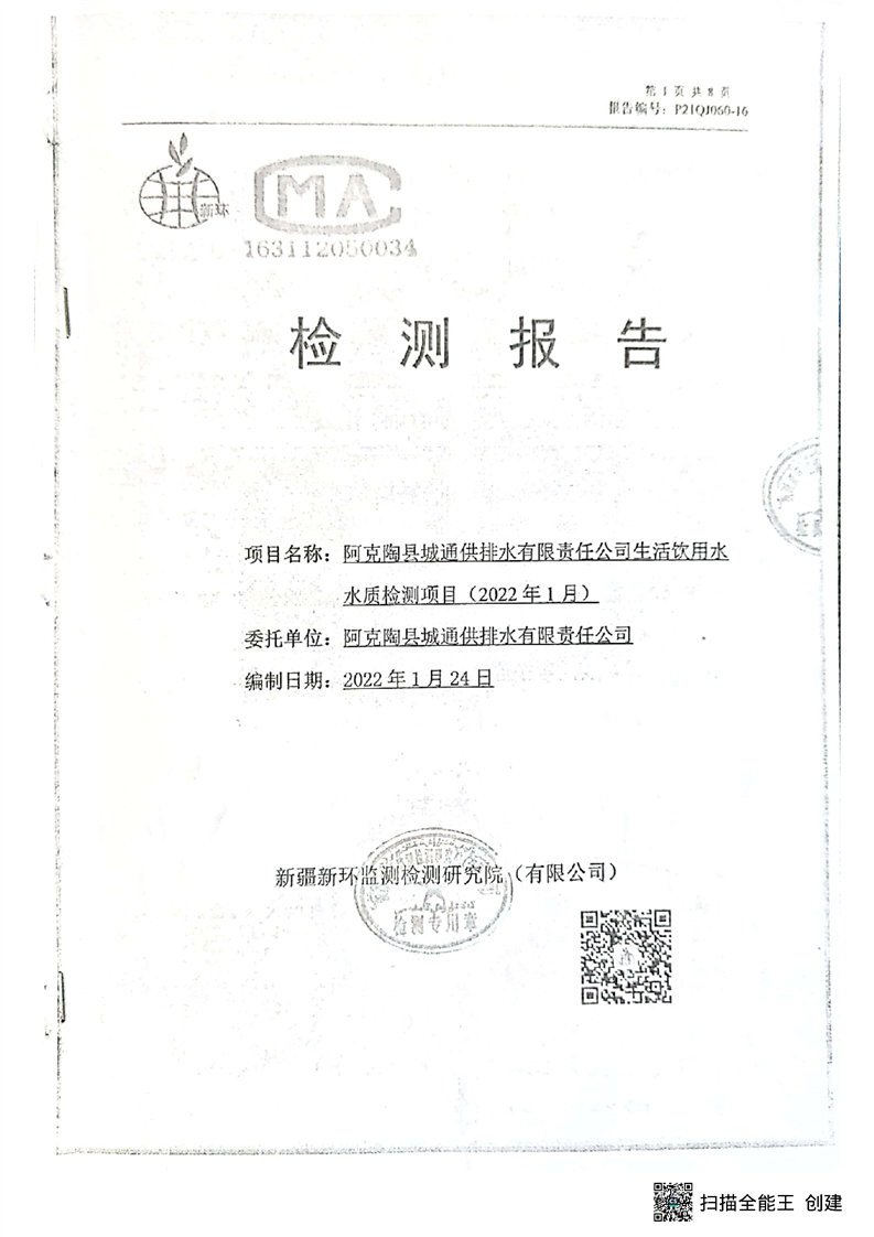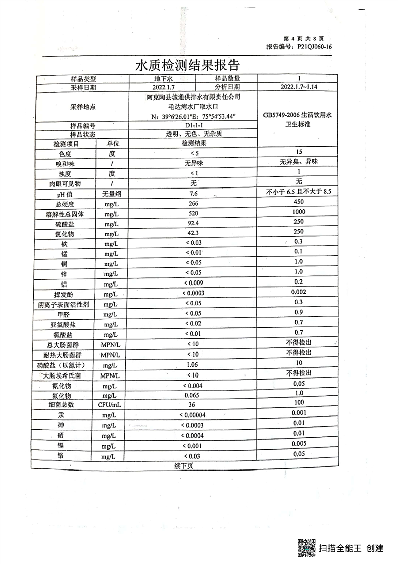 阿克陶县2022年1月饮用水监测报告