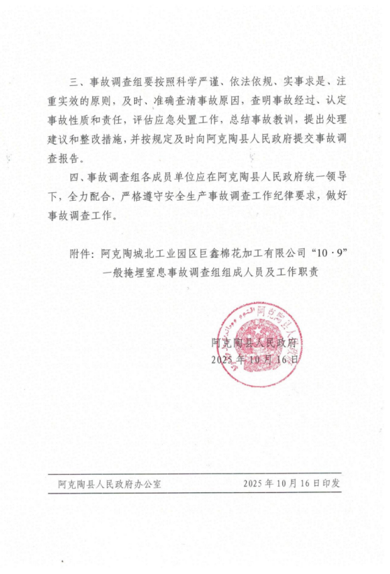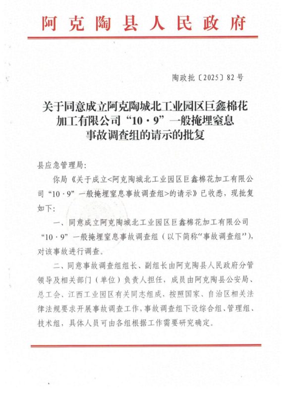 阿克陶城北工业园区巨鑫棉花加工有限公司“10·9”一般掩埋窒息事故调查组