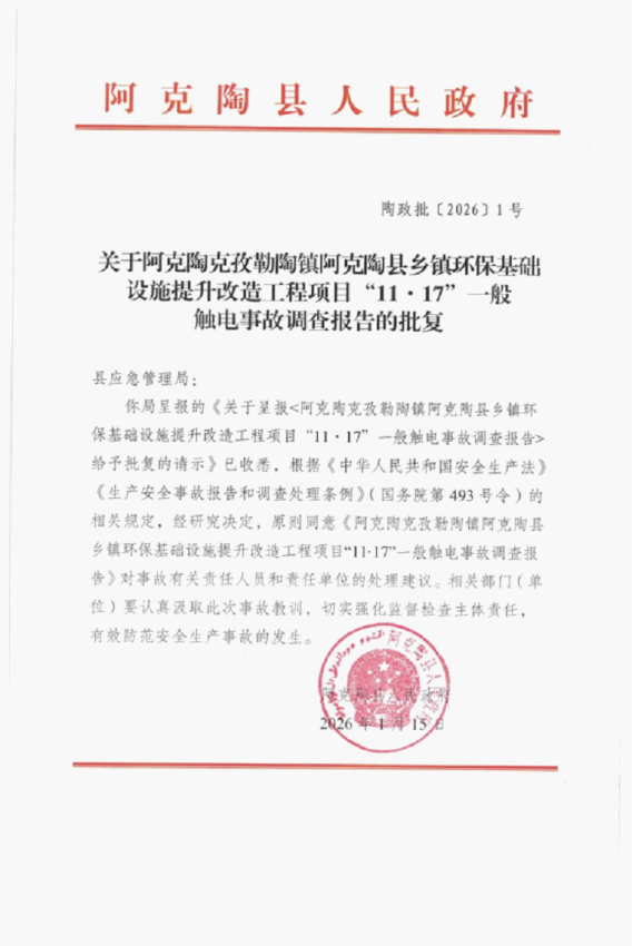 经调查认定,阿克陶县克孜勒陶镇乡镇环保基础设施提升改造工程项目“11·17”一般触电事故是一起因在35千伏高压电线下方施工人员违规作业,造成两人触电身亡的一般生产安全责任事故。