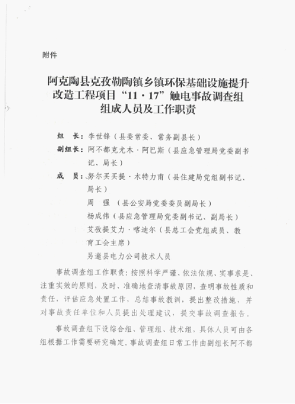 依据《中华人民共和国安全生产法》《中华人民共和国建筑法》《生产安全事故报告和调查处理条例》(国务院令第493号)、《建设工程安全生产管理条例》(国务院令第393号)、《新疆维吾尔自治区生产安全事故报告和调查处理实施办法》(自治区人民政府令第196号)等有关法律法规,经阿克陶县人民政府批准,成立了由阿克陶县人民政府常务副县长李世峰任组长,县应急管理局、公安局、总工会、住建局等有关单位为成员单位的阿克陶克孜勒陶镇乡镇环保基础设施提升改造项目“11·17”触电事故调查组(以下简称“事故调查组”),另邀电力公司参与,对该起事故进行了调查。