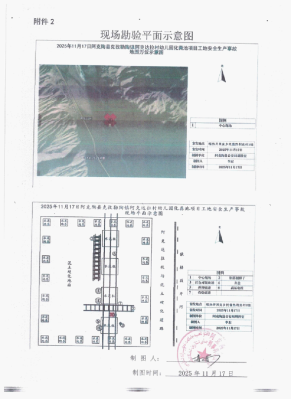 1.涉事地点。位于阿克陶县克孜勒陶镇阿克达拉村幼儿园化粪池项目工地,坐标为东经75.996022、北纬38.464500。以克孜勒陶镇阿克达拉村幼儿园化粪池项目工地为中心,现场的东侧为阿克达拉村硬质泥土路面及依格孜牙河;现场的南侧为阿克达拉村村委会规划用地;现场的西侧为阿克达拉村幼儿园;现场的北侧为穆斯**·**提小树林。