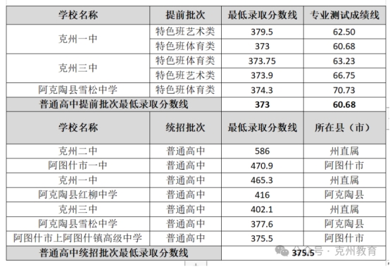 2024年克州高中阶段录取信息统计工作于8月13日结束。录取工作严格执行自治区下达的招生计划以及《2024年自治州高中阶段招生工作实施方案》的规定,从高分到低分按照考生的位次和志愿顺序录取(若总分相同则依次按语文、数学、外语、物理化学、道德与法治历史学科成绩从高到低排序)。网上公示查询从2024年8月13日21时00分正式开始,公示截止时间为2024年8月21日21时00分。现将克州2024年普通高中学校各批次最低录取分数线公布如下: