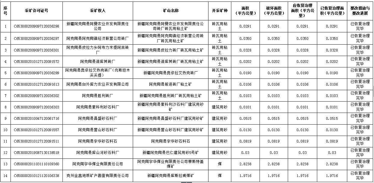 阿克陶县14家已闭坑矿山、政策性关闭小煤矿、砂石粘土矿地质环境恢复治理项整改措施均按序时进度全部落实到位,且该项任务完成情况分别通过责任单位和阿克陶县行业主管部门组织验收。