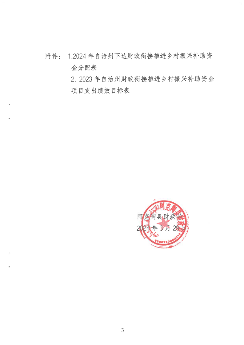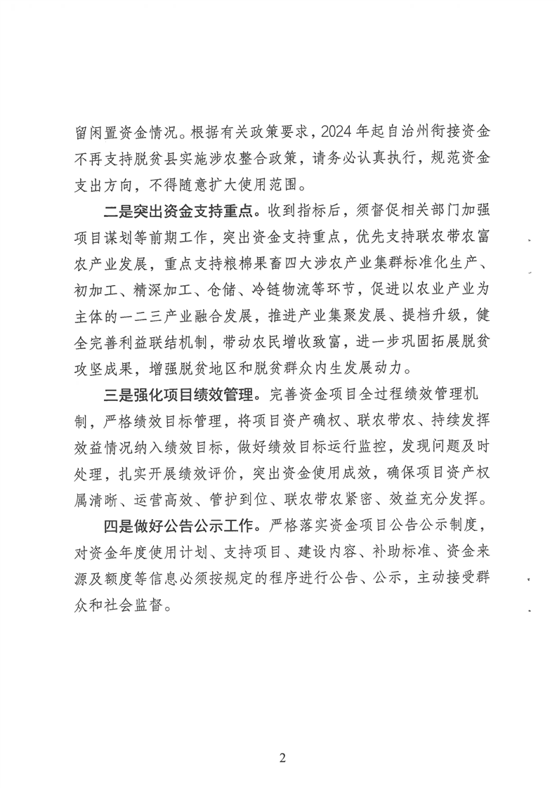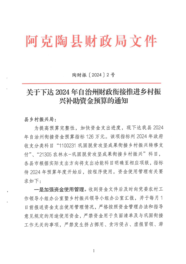 关于下达2024年自治州财政衔接推进乡村振兴补助资金预算的通知