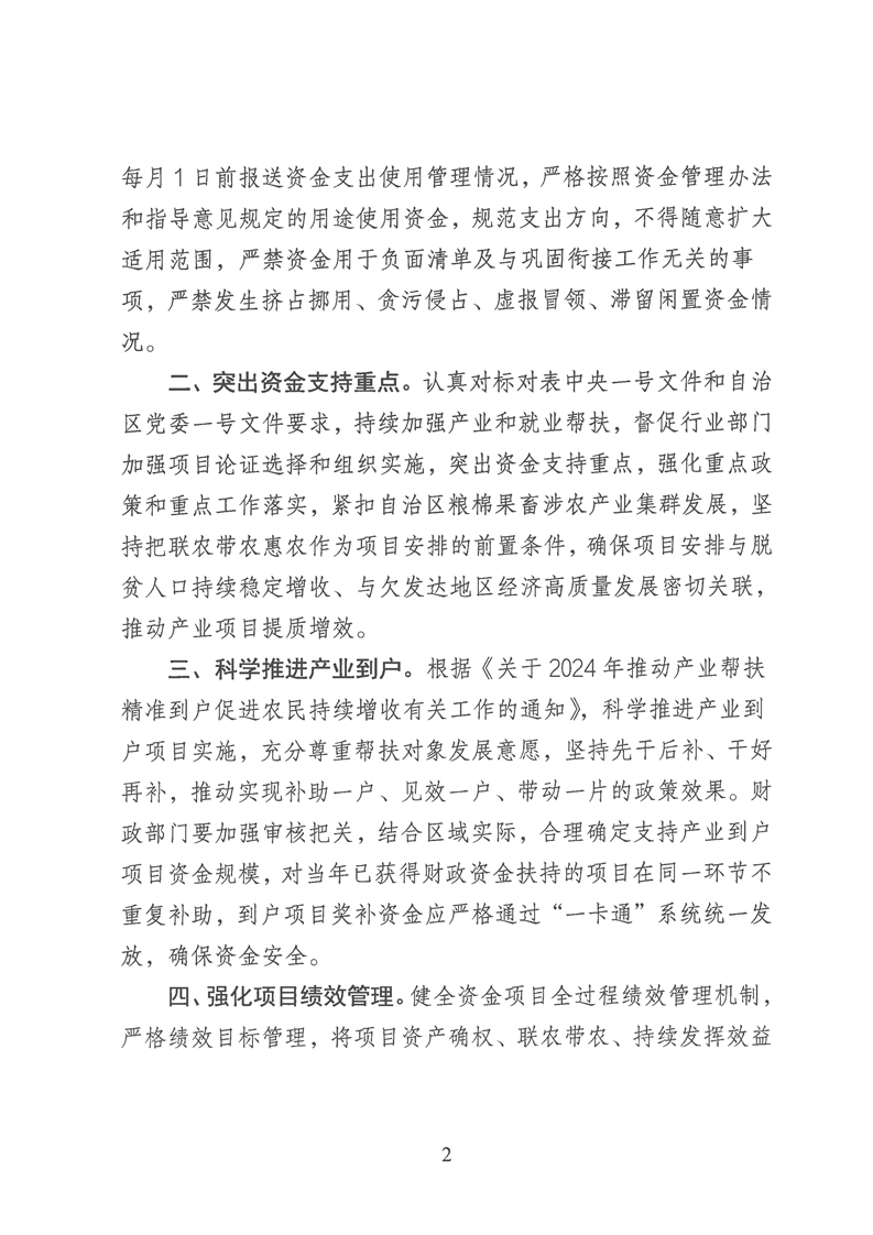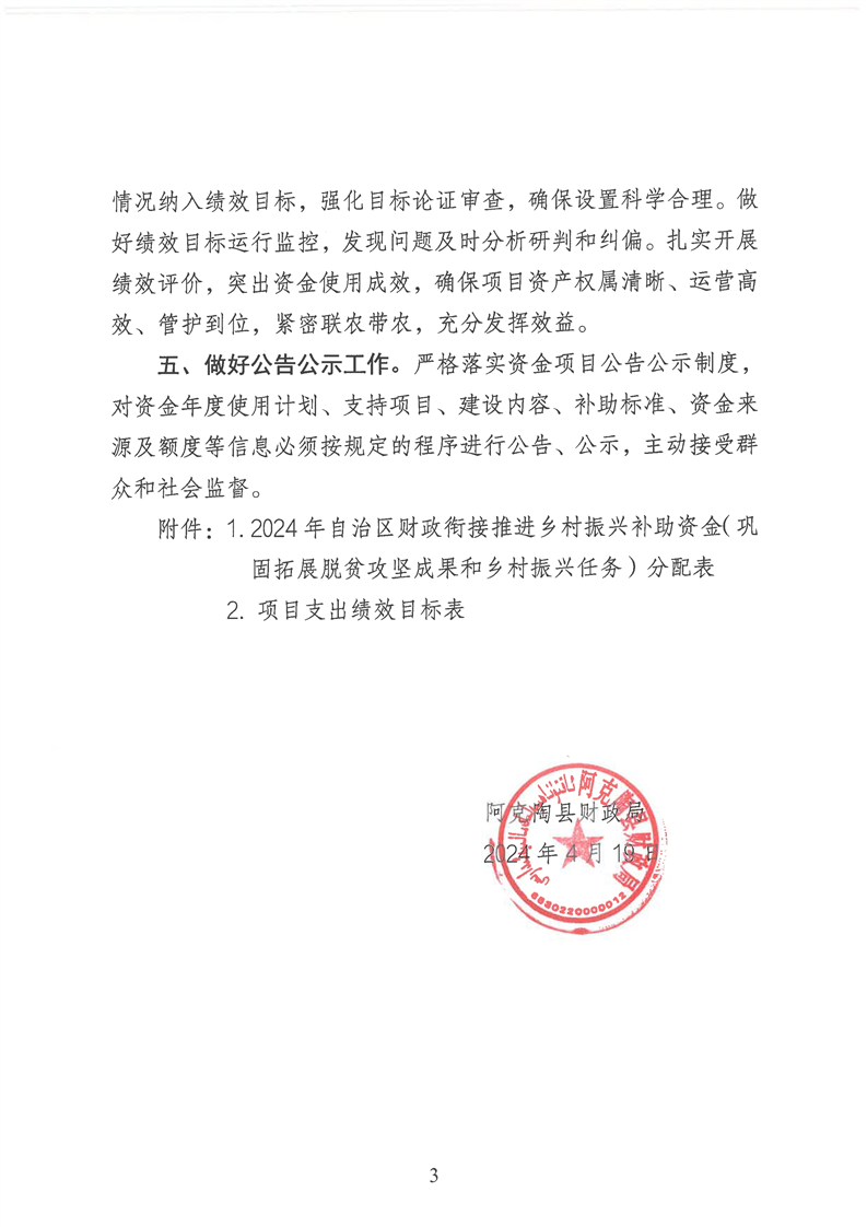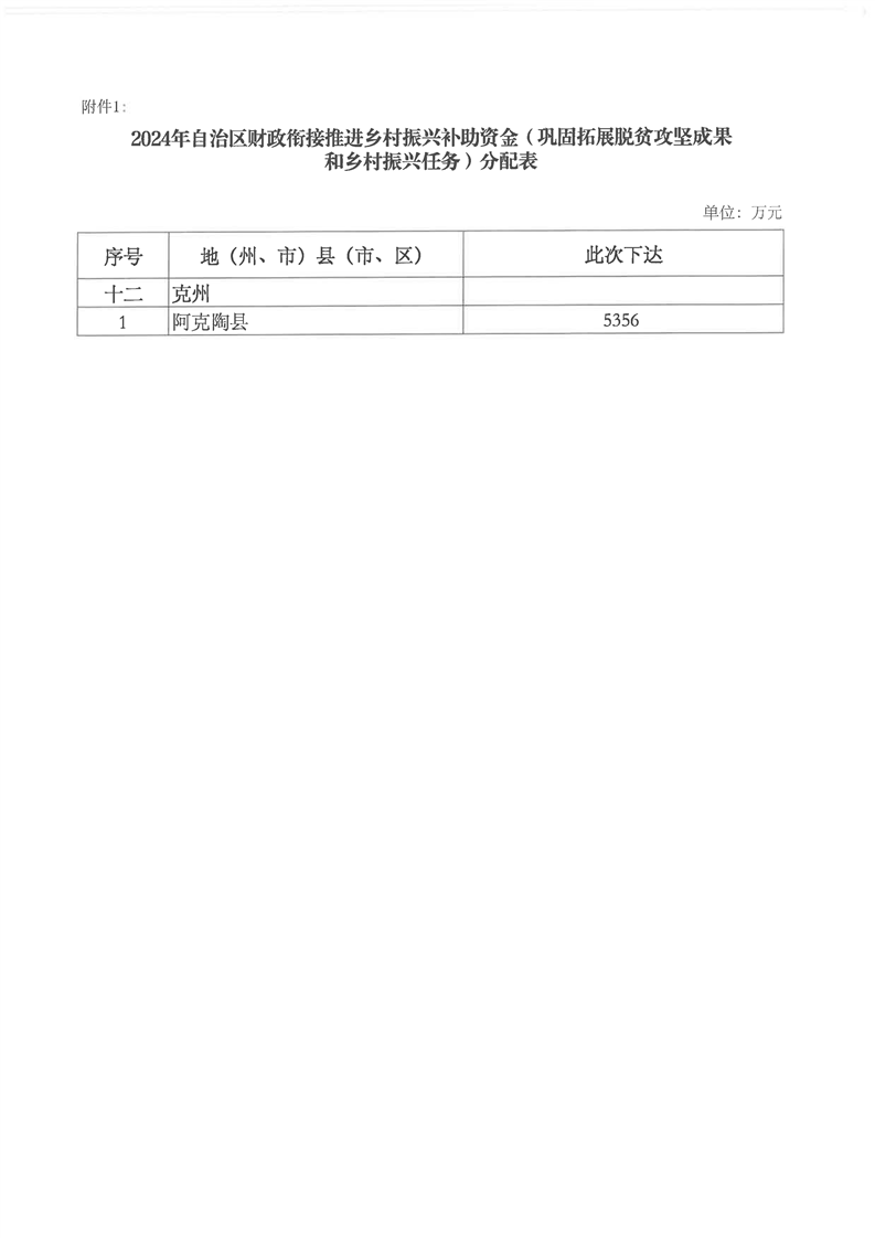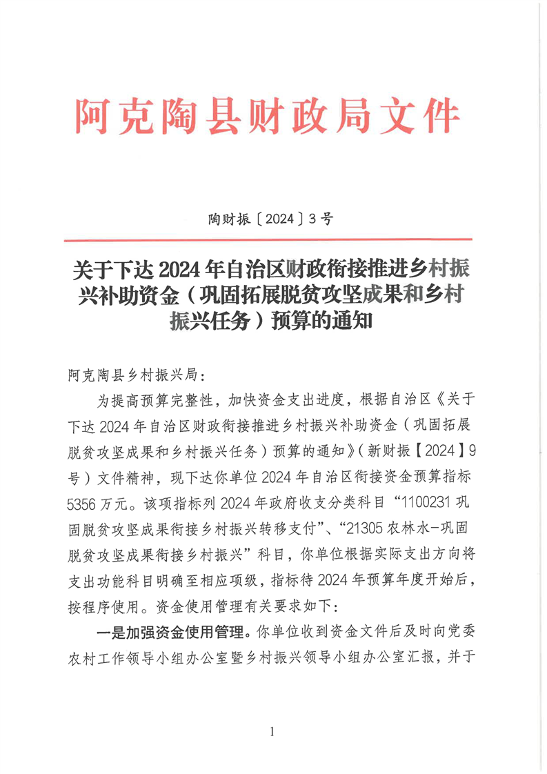 关于下达2024年自治区财政衔接推进乡村振兴补助资金(巩固拓展脱贫攻坚成果和乡村振兴任务)预算的通知