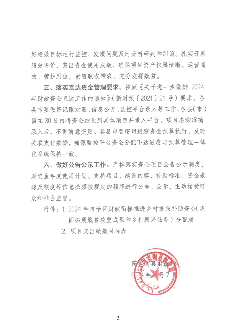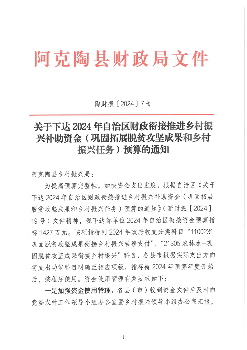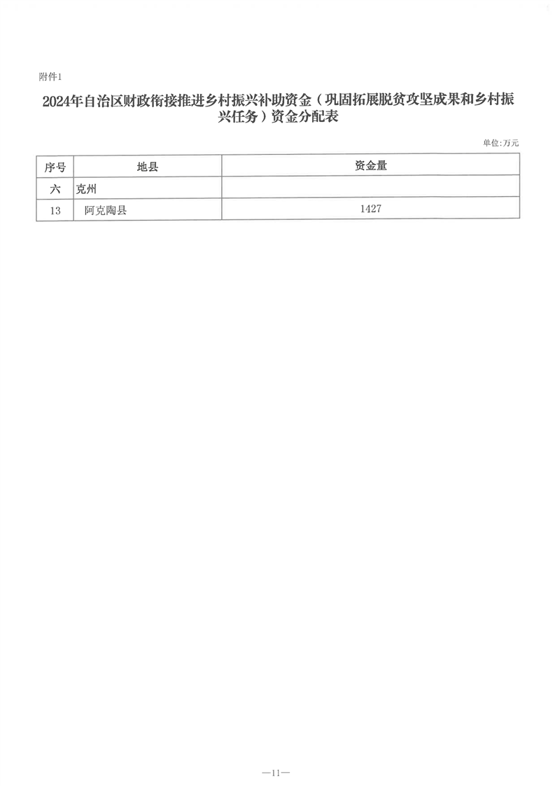 关于下达2024年自治区财政衔接推进乡村振兴补助资金(巩固拓展脱贫攻坚成果和乡村振兴任务)预算的通知