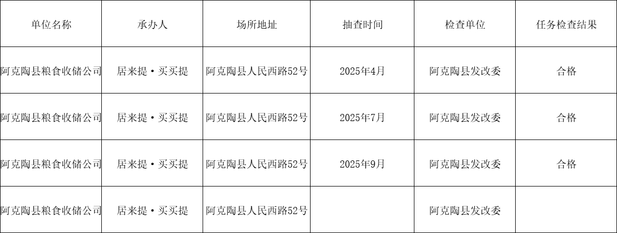 阿克陶县辖区“双随机、一公开”粮食安全2025年抽查结果