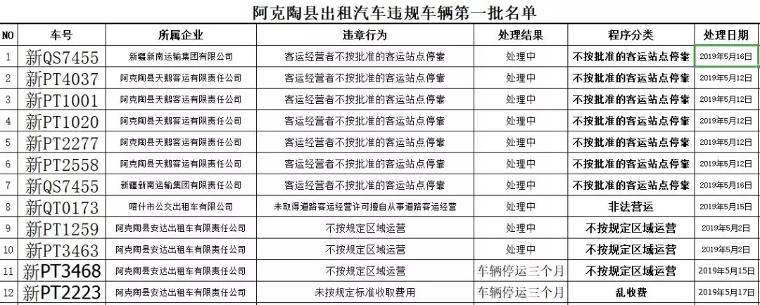按照“有黑扫黑、有恶除恶、有乱治乱”的工作要求,连日来,针对我县出租汽车运输行业中存在的非法运营、无证上岗、强拉强载、乱收费、拒载、未按规定线路行驶以及非法网约车等行为乱象,阿克陶县交通运输局联合道路运输、客运、交警等部门联合开展了集中整治黑车行动,净化出租汽车运输行业发展环境。截至目前,共依法依规查处各类违法违规运营车辆共32辆,其中私家车、网约车等非法营运13辆,违规出租汽车19辆,现将第一批车辆名单予以公告,希望广大市民群众积极参与、举报打击非法营运车俩,营造良好的客运市场,为方便广大市民安全出行保驾护航。