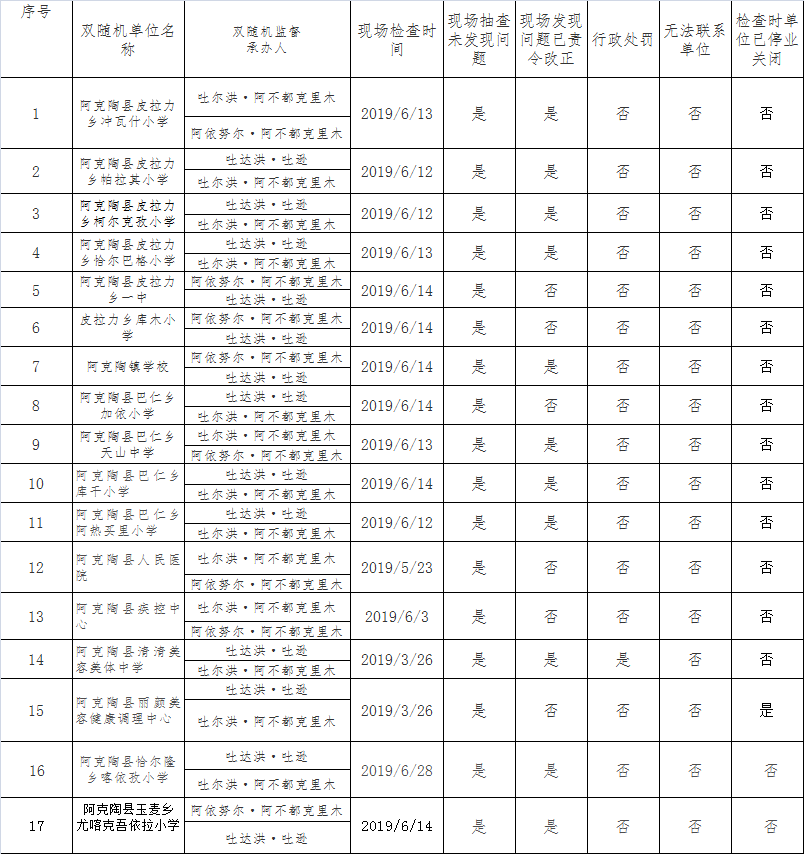 2019年双随机单位基本处置情况公示登记表