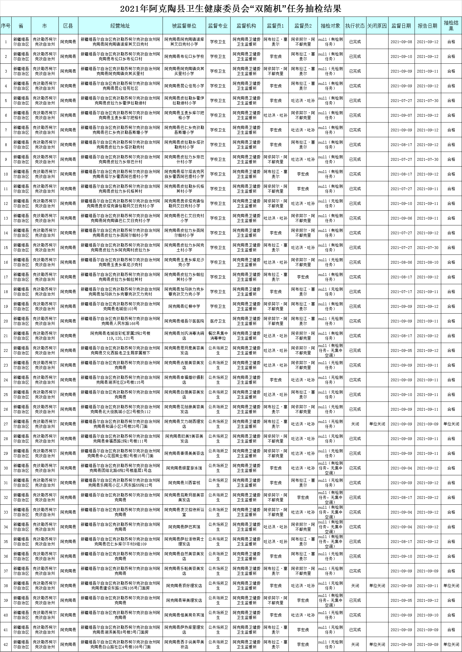 2021年阿克陶县卫生健康委员会“双随机”任务抽检结果