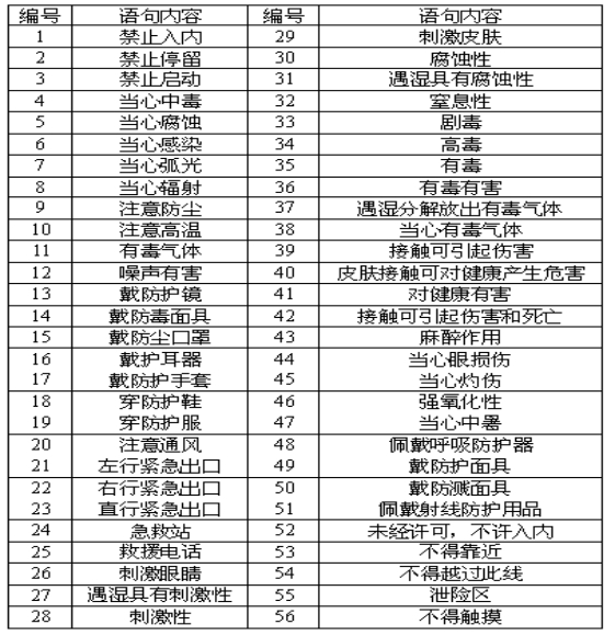 警示语句是一组表示禁止、警告、指令、提示或描述工作场所职业病危害的词语。警示语句可单独使用,也可与图形标识组合使用。如下表: