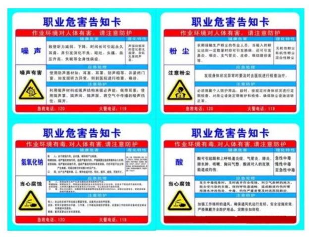 根据实际需要,由各类图形标识和文字组合成《有毒物品作业岗位职业病危害告知卡》(以下简称告知卡)。《告知卡》是针对某一职业病危害因素,告知劳动者危害后果及其防护措施的提示卡。《告知卡》是设置在使用高毒物品作业岗位醒目位置上的一种警示,它以简洁的图形和文字,将作业岗位上所接触到的有毒物品的危害性告知劳动者,并提醒劳动者采取相应的预防和处理措施。《告知卡》包括有毒物品的通用提示栏、有毒物品名称、健康危害、警告标识、指令标识、应急处理和理化特性等内容。