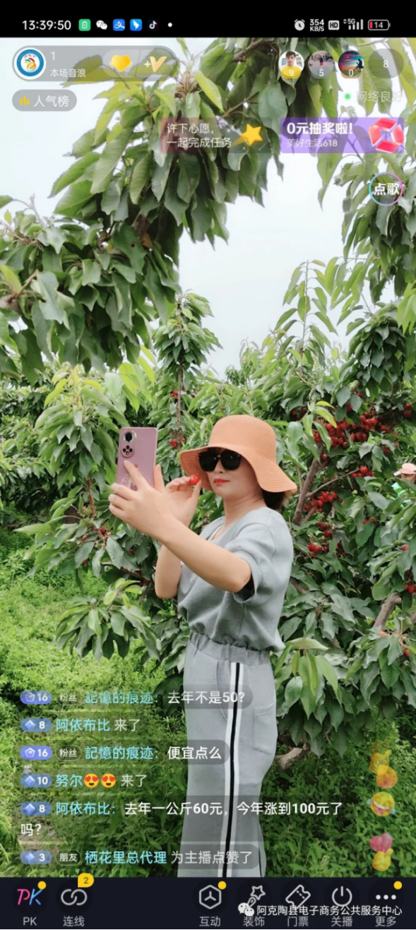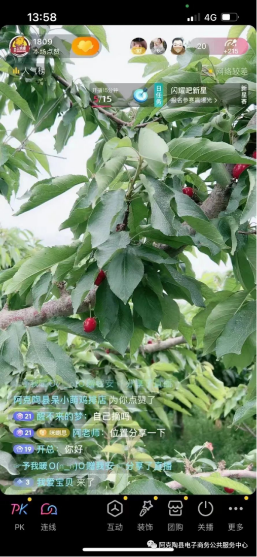 “欢迎大家周末带着自己的孩子来樱桃采摘园,这里的樱桃又大又甜,终于可以实现樱桃自由啦!”阿克陶县抖音本地生活推广团队王倩倩、杨新爱、巴赫三位创业达人分别以不同的风格形式向直播间里的粉丝们介绍阿克陶县本地樱桃。