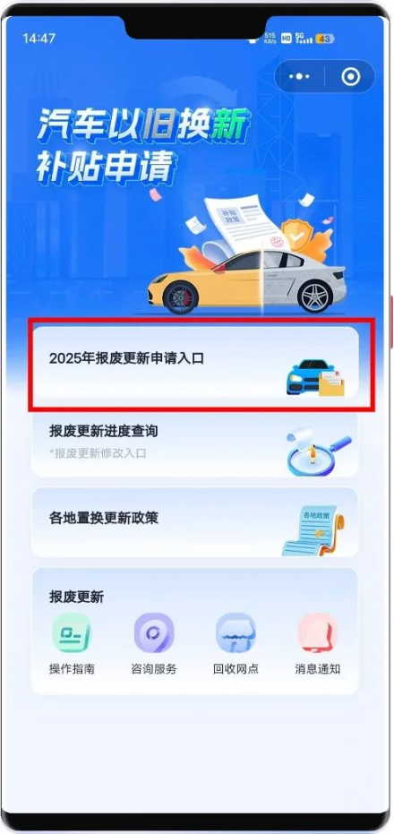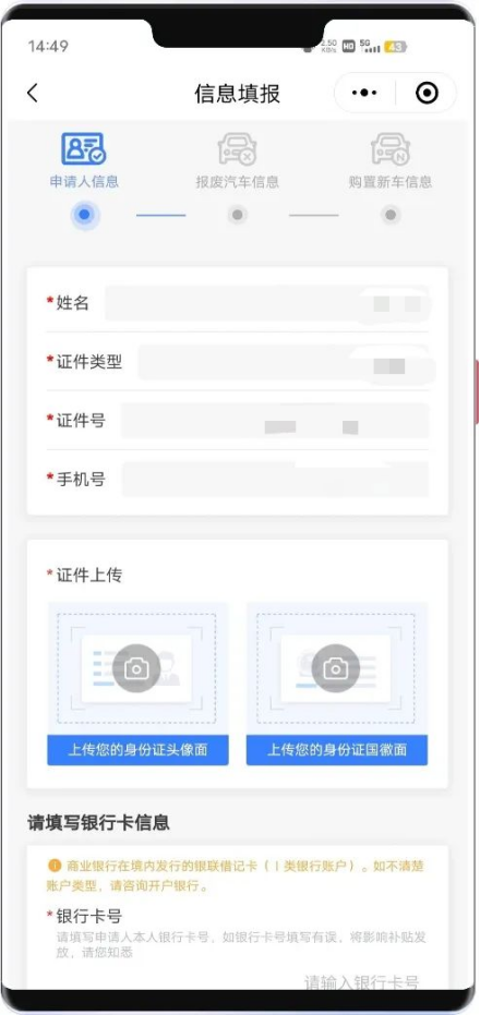 ③根据提示,填写申请人信息、报废汽车信息、购置新车信息,即可申请汽车以旧换新补贴。