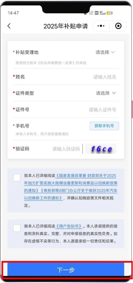 ②选择补贴受理地,根据提示输入个人信息,点击下一步。