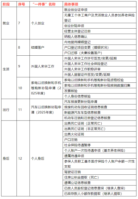 《清单》中包含固定资产投资项目审批、新车上牌等企业事项和结婚落户、家电以旧换新和手机等购新补贴申请(2025年度)、汽车以旧换新补贴申请(2025年度)等个人事项。