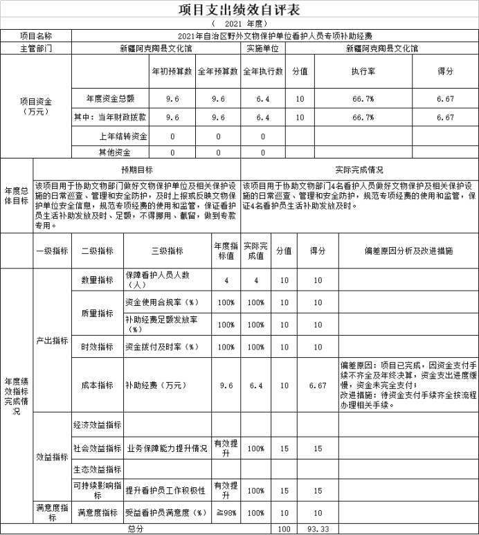 根据预算绩效管理要求,我单位2021年度开展预算绩效评价项目1个,共涉及资金6.4万元。预算绩效管理取得的成效:一是协助文物部门做好文物保护单位及相关保护设施的日常巡查、管理和安全防护;二是保障了野外文物看护员生活质量。发现的问题及原因:补助发放缓慢。下一步改进措施:一是加快资金支付进度;二是加强绩效管理。具体项目自评情况附项目支出绩效自评表。
