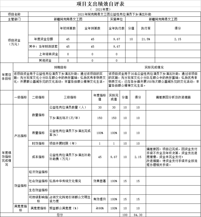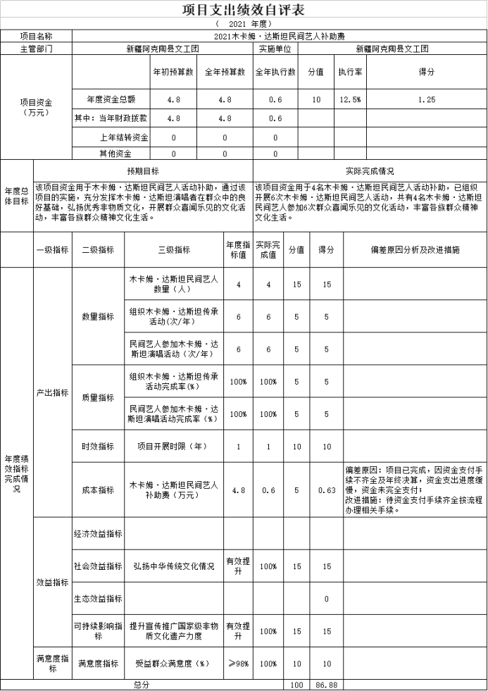 根据预算绩效管理要求,我单位2021年度开展预算绩效评价项目2个,共涉及资金10.27万元。预算绩效管理取得的成效:一是弘扬了优秀非物质文化遗产文化;二是开展了农牧民喜闻乐见的文娱活动。发现的问题及原因:因疫情影响,减少了演出场次。下一步改进措施:一是加强绩效管理监控;二是根据实际情况及时调整演出安排。具体项目自评情况附项目支出绩效自评表。
