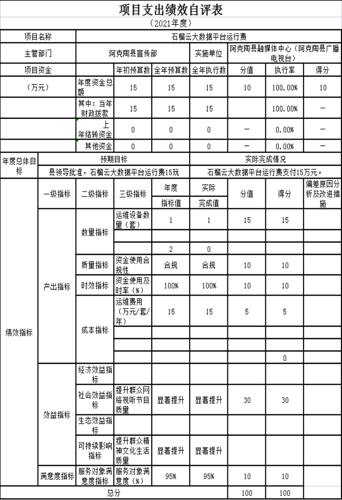 根据预算绩效管理要求,我单位2021年度开展预算绩效评价项目1个,共涉及资金15万元。预算绩效管理取得的成效:一是贯彻落实党和政府有关新闻宣传的方针政策,严格新闻宣 传纪律,把党和政府的声音及时传播到广大人民群众中去,组织, 二是技术保障维护,设备管理等工作,保证节目的正常。发现的问题及原因:一是资金使用及时率低;二是项目支出任务低。下一步改进措施:一是继续加强设备管理,把党和政府的声音及时传播到广大人民群众;二是加大项目投入提高项目资金使用及时率。具体项目自评情况附项目支出绩效自评表。三是加强管理措施,加强项目实施和监管和控制措施,收集完整验收资料,完善项目实施效果评价。进一步加强开展相关业务工作培训。专业性强,工作量大,建议财政有关业务部门组织培训,切实推进绩效评价工作开展。