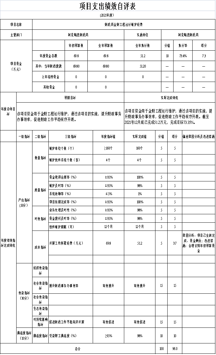 第一个项目是金财工程运行维护经费,涉及资金51.2万元。预算绩效管理取得的成效:一是通过该项目的实施,保障预算单位各项财务工作正常运行,提升财政事务办事效率;二是促进工作平稳有序开展。发现的问题及原因:项目已全部完成,资金剩余。下一步改进措施:做好部门预算,合理有效管理使用资金。具体项目自评情况附项目支出绩效自评表。