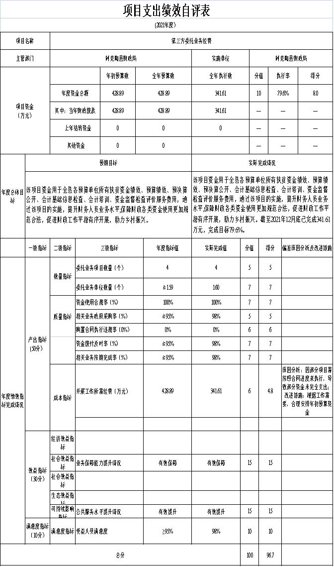 第二个项目是第三方委托业务经费,涉及资金341.61万元。预算绩效管理取得的成效:一是通过该项目的实施,提升财政事务办事效率;二是促进工作平稳有序开展。发现的问题及原因:因部分项目需按照合同进度来执行,导致部分资金未完全支出。下一步改进措施:一是加强绩效评价管理和流程的建设;二是建立全过程的预算绩效管理机制;三是根据工作需要,合理安排年初预算资金。具体项目自评情况附项目支出绩效自评表