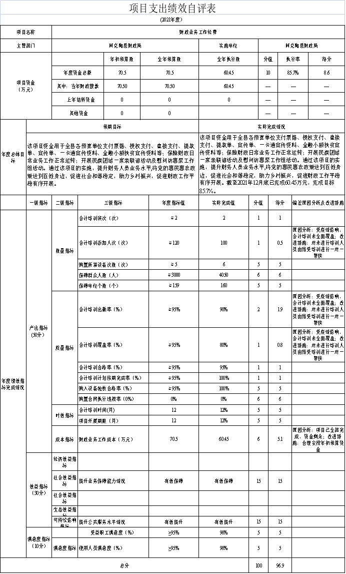 第三个项目是财政业务工作经费,涉及资金60.45万元。预算绩效管理取得的成效:一是通过该项目的实施,提升财务人员业务水平;二是通过该项目的实施,将党的惠民惠农政策送到百姓身边,促进社会和谐稳定,助力脱贫攻坚,促进财政工作平稳有序开展。发现的问题及原因:受疫情影响,会计培训未全面覆盖;下一步改进措施:一是对未进行培训人员由接受培训进行一对一帮扶;二是加快资金拨付进度,提高项目执行率;三是做好部门预算,合理有效管理使用资金。具体项目自评情况附项目支出绩效自评表。