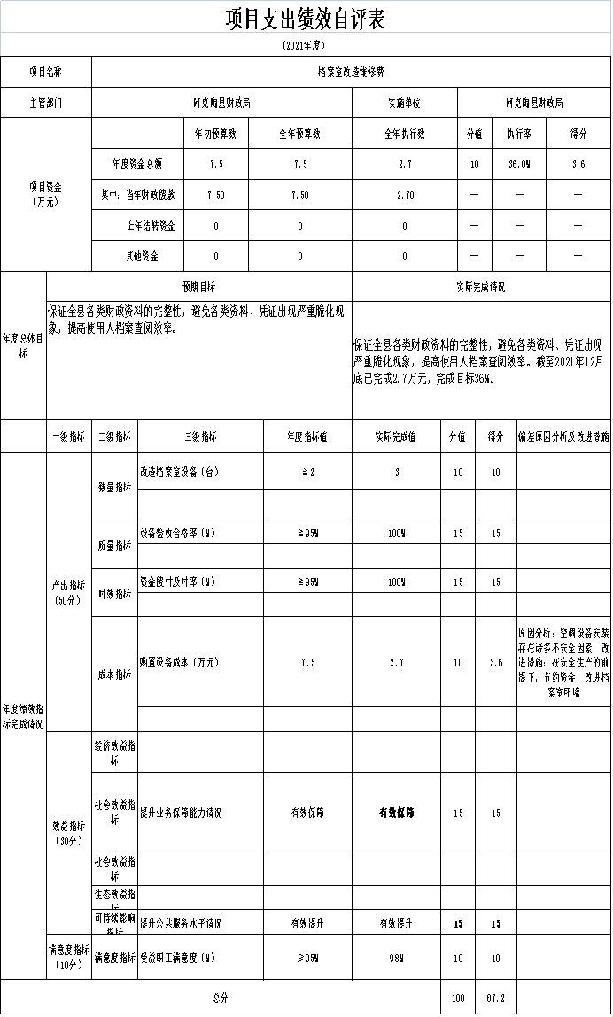第四个项目是档案室改造维修费,涉及资金2.7万元。预算绩效管理取得的成效:通过该项目的实施保证全县各类财政资料的完整性,避免各类资料、凭证出现严重脆化现象,提高使用人档案查阅效率。发现的问题及原因:档案室维修改造过程存在诸多因素;下一步改进措施:一是在安全生产的前提下,节约资金,改进档案室环境;二是做好部门预算,合理有效管理使用资金。具体项目自评情况附项目支出绩效自评表。