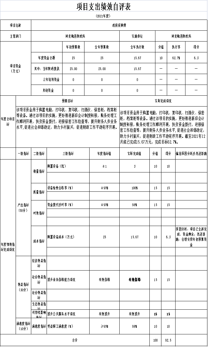 第五个项目是政府采购费,涉及资金15.67万元。预算绩效管理取得的成效:通过该项目的实施,更好推进账务处理工作顺利开展,扶贫资金拨付,迎接保密工作检查等,提升财务人员业务水平,促进社会和谐稳定,助力乡村振兴,促进财政工作平稳有序开展。发现的问题及原因:项目已全部完成,资金剩余。下一步改进措施:做好部门预算,合理有效管理使用资金。具体项目自评情况附项目支出绩效自评表。