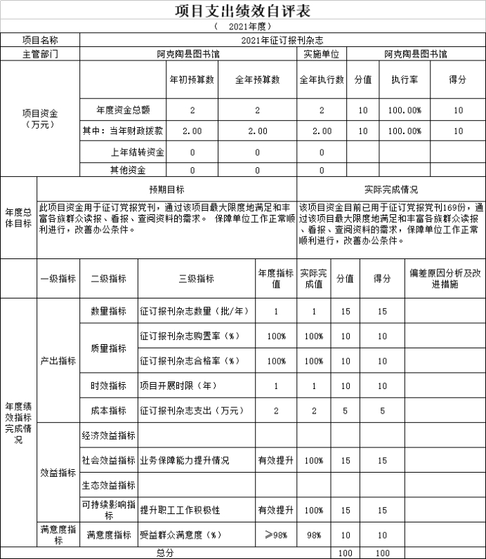 根据预算绩效管理要求,我单位2021年度开展预算绩效评价项目1个,共涉及资金2万元。预算绩效管理取得的成效:一是最大限度的满足和丰富各族群众读报、看报、查阅资料的需求;二是保障单位工作顺利进行。发现的问题及原因:征订的书籍杂乱繁。下一步改进措施:有目标的征订所需书籍,使经费使用发挥最大效益。具体项目自评情况附项目支出绩效自评表。