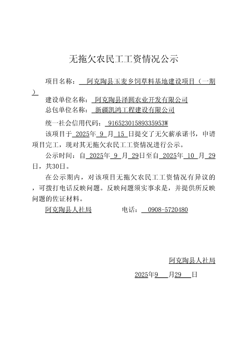 关于新疆凯鸿工程建设有限公司阿克陶县玉麦乡饲草料基地建设项目(一期)的完工公示