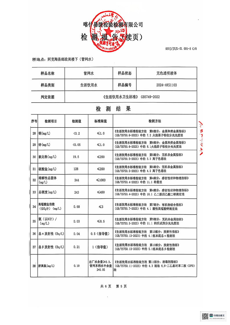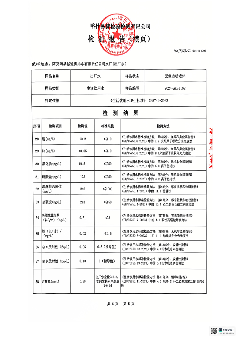 阿克陶县生活饮用水11月检测报告