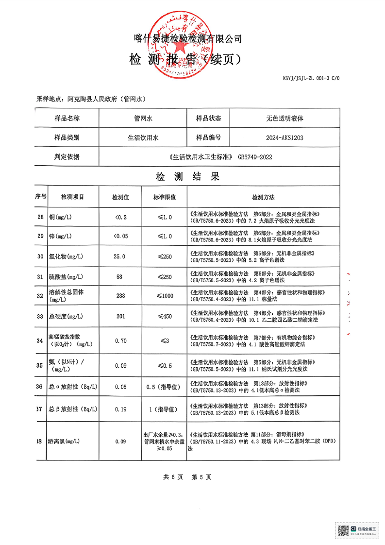 阿克陶县生活饮用水12月检测报告